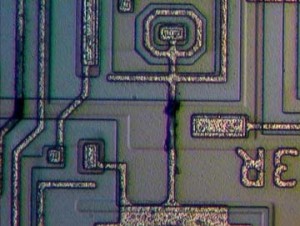 The unique characteristic of interference contrast comes from the fact that each packet intersects the sample at slightly different points. If the two points on the surface are at different elevations, each light packet travels a different round trip distance from the prism to the sample and return. That difference adds or interferes as the packets are recombined in the prism. Etch pits and cracks which are not detectable in brightfield will stand out clearly enough to be photographed in interference contrast. By rotating the initial polarization, the analyst can change the interference patterns to maximize contract in specific areas of interest. Nomarski is especially good for observing the die topography on semiconductors, VLSI, memory, logic, and microprocessors. Is capable of locating point defects, line defects, twinning, stack faults, and other silicon defects.